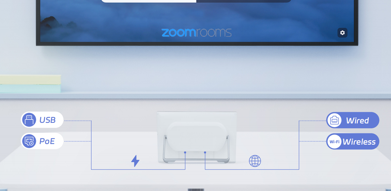 Two kinds of power supply modes: USB and PoE. The RT10 can connect video conferecing system through wired network or Wi-Fi.