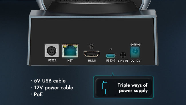 Soporta simultáneamente el uso de cable USB de 5V, cable de alimentación de 12V y PoE para el suministro de energía.