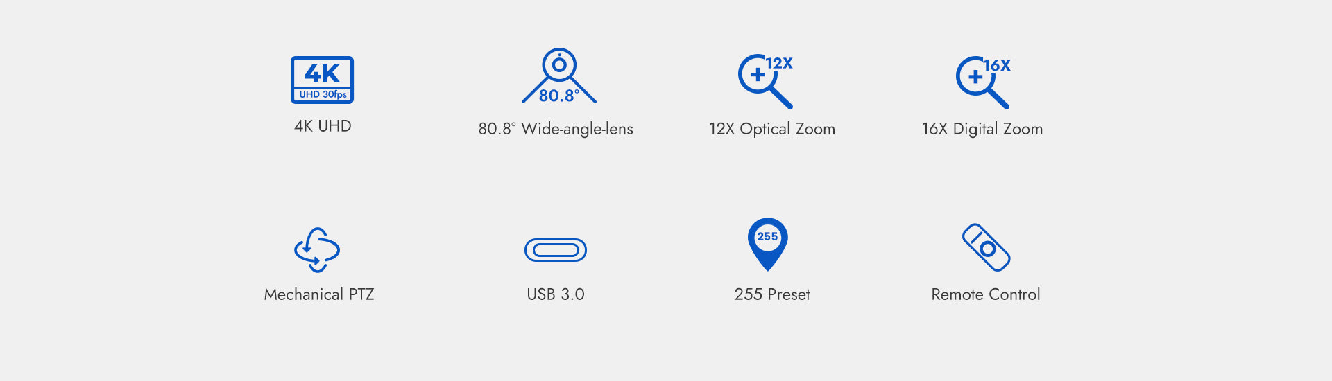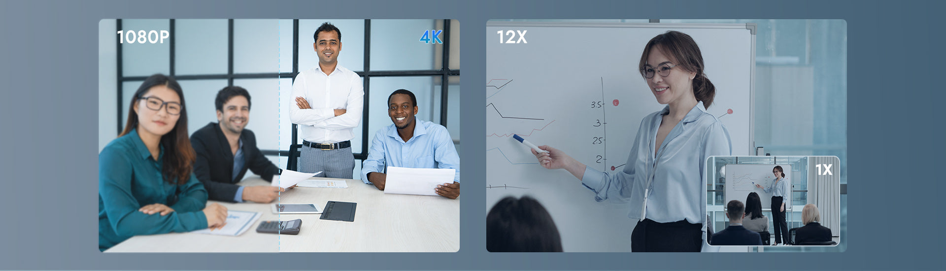 Uitgerust met een 80,8° groothoeklens, beschikt deze camera over 12x optische zoom en 16x digitale zoom, waardoor details zowel dichtbij als ver in de vergaderruimte helder worden vastgelegd zonder vervorming aan de randen van het beeld.