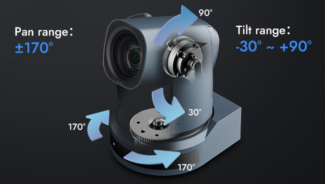 Uitgerust met een stille mechanische PTZ, heeft deze camera een horizontale rotatiebereik van ±170° en een verticale rotatiebereik van -30°~+90°, waardoor de hele vergaderruimte volledig wordt gedekt zonder blinde hoeken, zelfs in hoekposities.